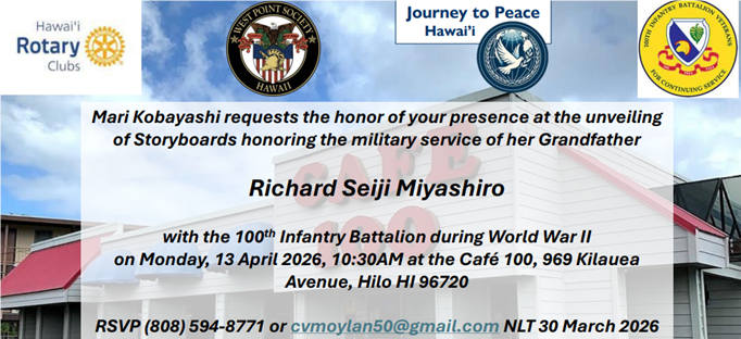 The Rotary Club of Pearl Harbor in coordination with the Rotary Clubs of Hickam Pearl Harbor and Hilo along with Journey to Peace Hawaii, the 100th Battalion Veterans Association, and the West Point Association of Hawaii are sponsoring an Unveiling Ceremony dedicating Storyboards in honor of Richard Miyashiro founder of the Cafe 100 in Hilo and a combat veteran of the 100th Infantry Battalion, 442nd Regimental Combat Team Nisei Warriors during World War II.