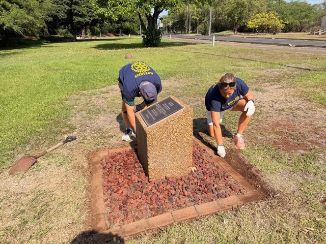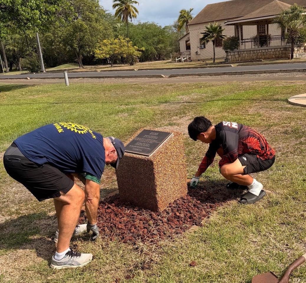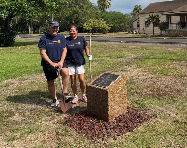 Rotary Club of Pearl Harbor members, Chris and Sue Moylan, annually clean and maintain a monument dedicated to the ultimate sacrifice of 5 Soldiers who defended Fort Kamehameha during the attack on Pearl Harbor in 1941.