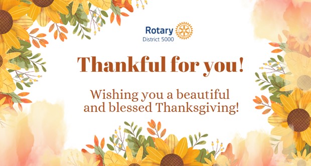 I am grateful for the privilege of being your District Governor and the ability to meet so many of you at your club meetings. Our Club and District Projects are amazing as we help our communities and the world. To think that we, as members of Rotary, are helping people live better lives around the world when we Unite for Good. God Bless you all this Thanksgiving and throughout the year.