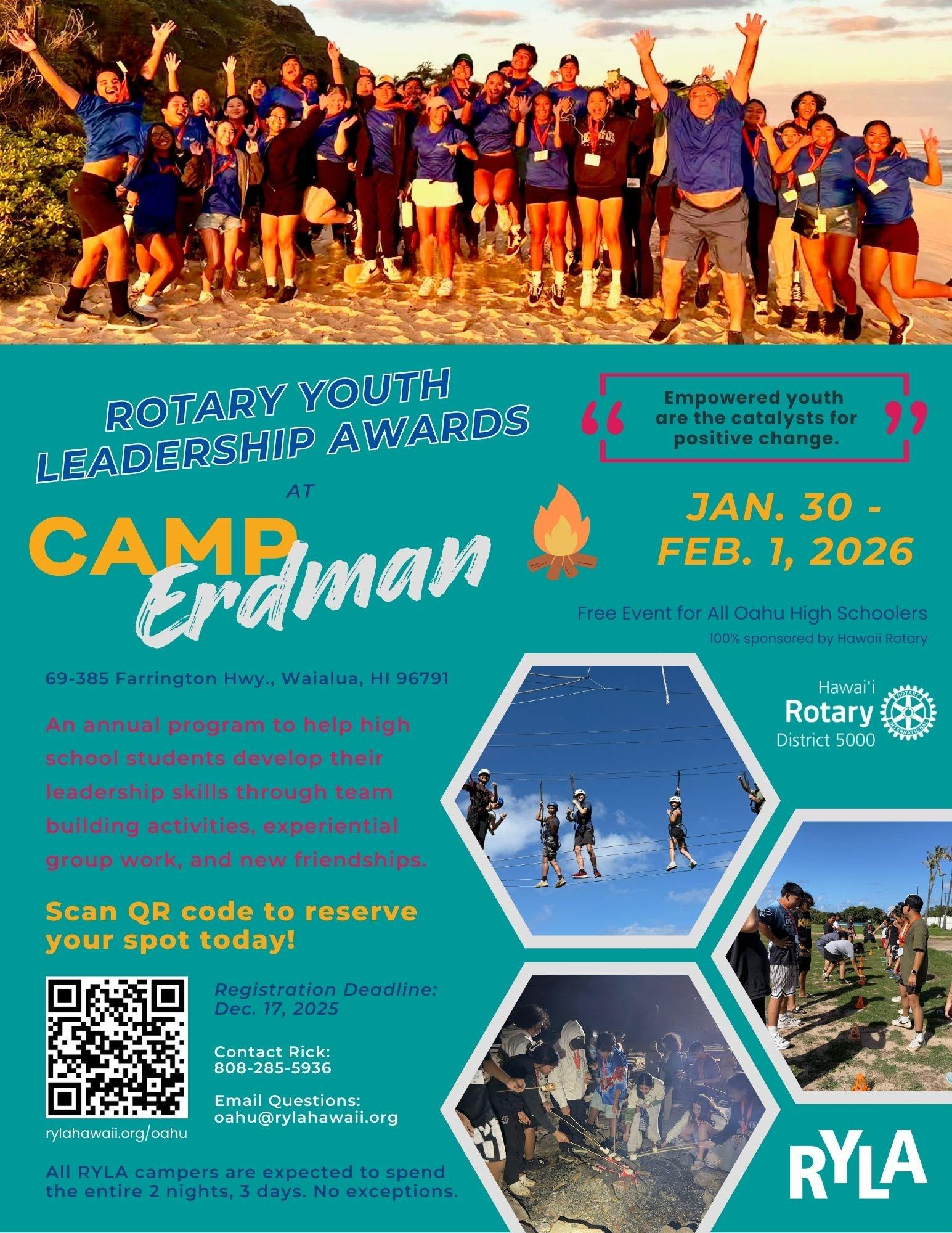 Discover the Power of Leadership with RYLA (Rotary Youth Leadership Awards) - an exciting and transformative weekend camp designed exclusively for high school students across the beautiful Hawaiian Islands. As a joint effort by the generous sponsors of Hawai'i Rotary District 5000 Clubs, RYLA is all about developing your leadership skills, empowering you to make a positive impact in your school and community.